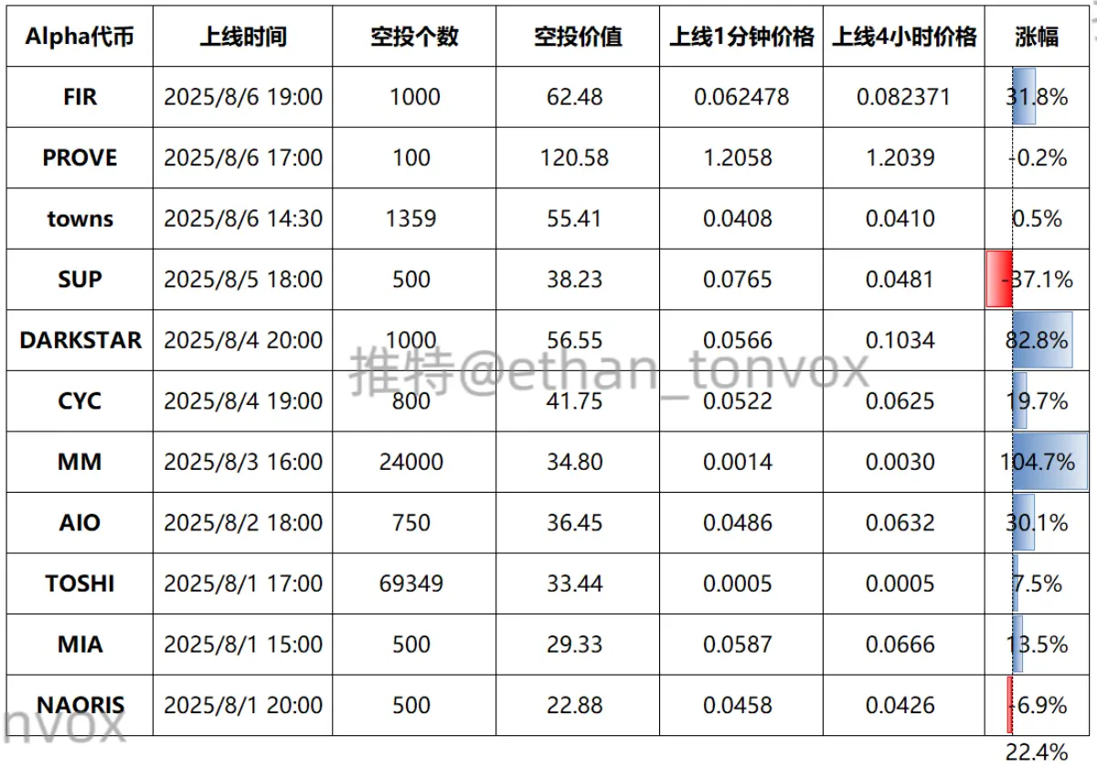 huangt 消息,据推特用户@ethan_tonvox 披露,8 月在币安 Alpha 平台上线的 11 个代币中,9 个实现上涨,平均 4 小时涨幅 22.4%。其中 MM 代币以 4 小时涨幅 104.7%涨幅居首,DARKSTAR 4 小时上涨 82.8%位列第二。