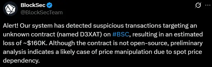 huangt 消息,据 Web3 安全公司 BlockSec 系统监测,BSC 生态上名为 D3XAT 的合约疑似遭到攻击,目前预估损失达 16 万美元。