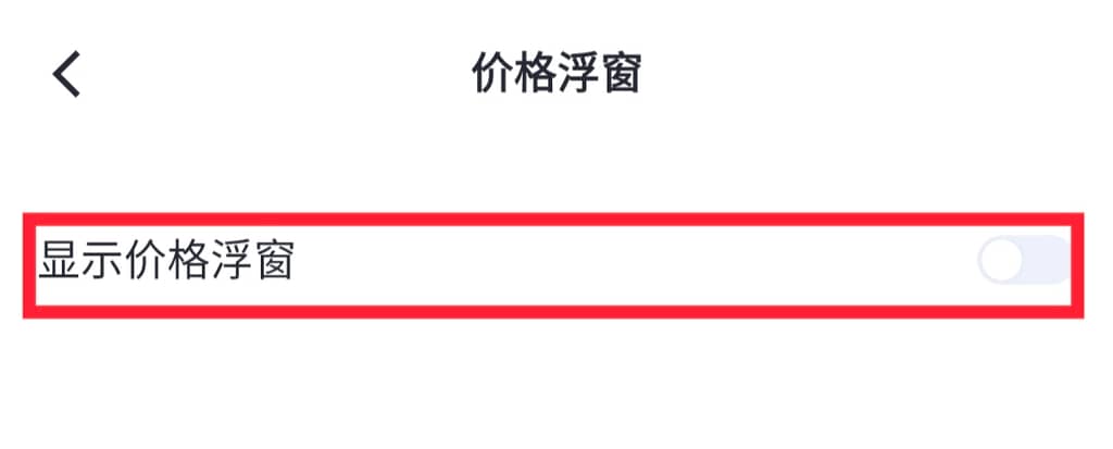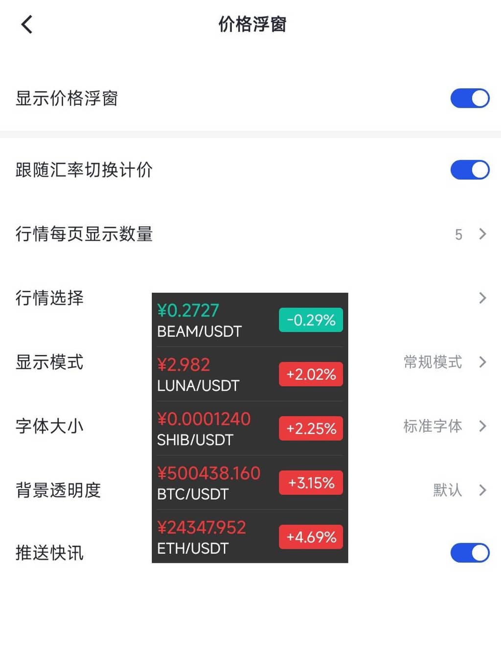 2.在 “价格浮窗” 页面可以点击开启/关闭 “显示价格浮窗” 开关。点击开启 “显示价格浮窗” 后,即可看到浮动窗口,同时在此界面可以进行参数设置。