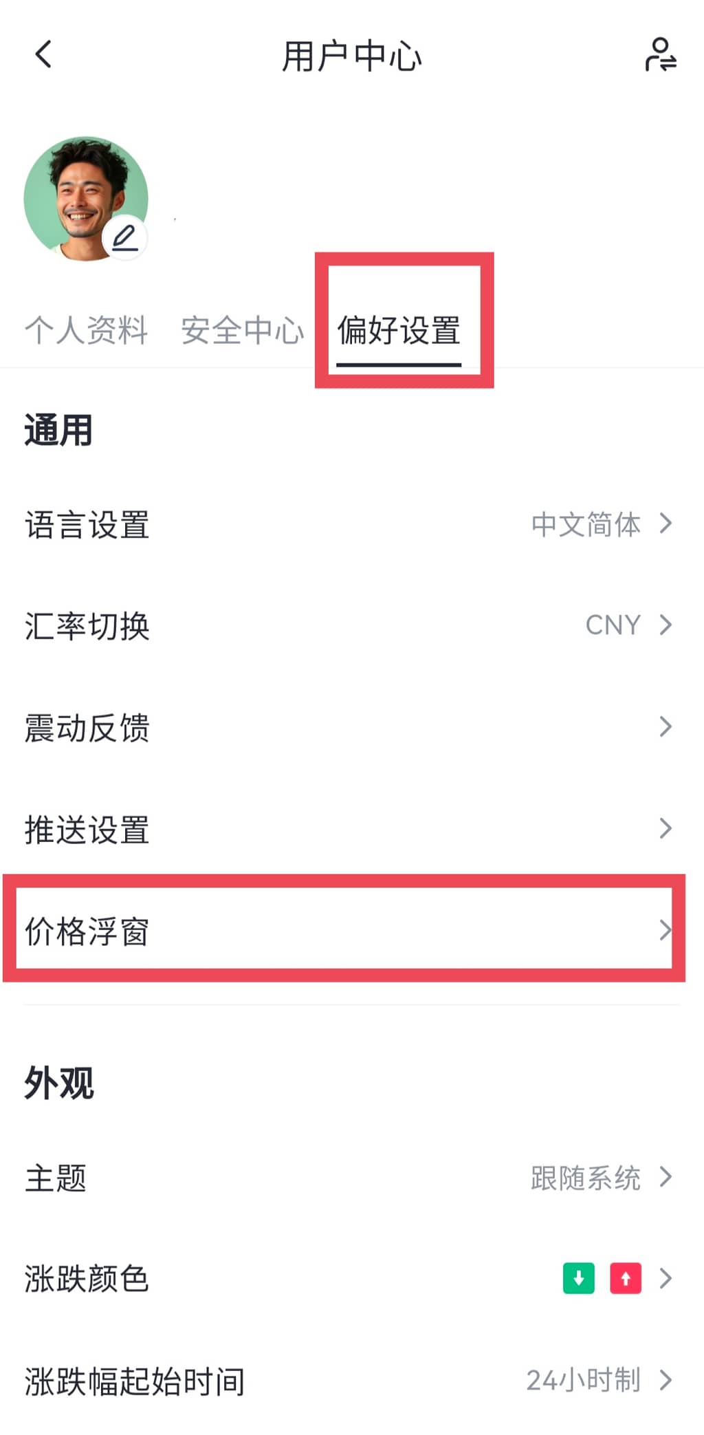 1.打开 Gate App 登录账户,在首页点击左上角 “头像” 标志,点击 “个人资料和设置” 右侧箭头,在 “偏好设置” 中选择 “价格浮窗”。