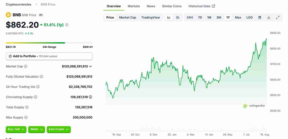 在2025年8月,BNB再次迎来辉煌时刻,价格屡创新高,引发市场广泛关注。根据Coingecko的数据显示,BNB价格在8月14日一度触及864美元,且涨势如虹,仅一周后的8月21日便攀升至881美元,创下历史新高。这一轮上涨,不仅巩固了BNB在加密货币市场的地位,也让投资者对其未来发展充满期待,让我们一起深入了解BNB此次价格飞跃的原因及未来趋势。