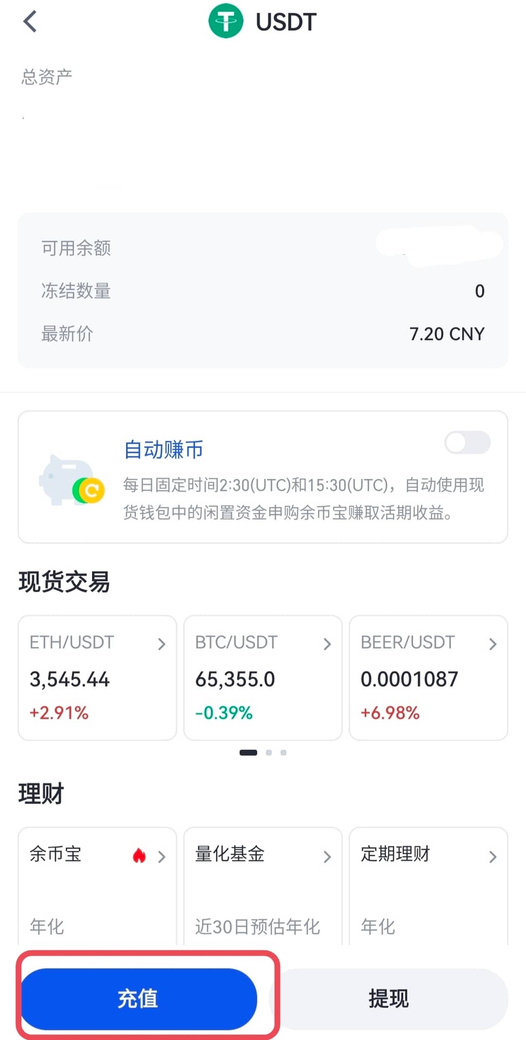 也可以点击“现货账户”,在搜索栏中搜索需要充值的币种,点击该币种下方的“充值”。