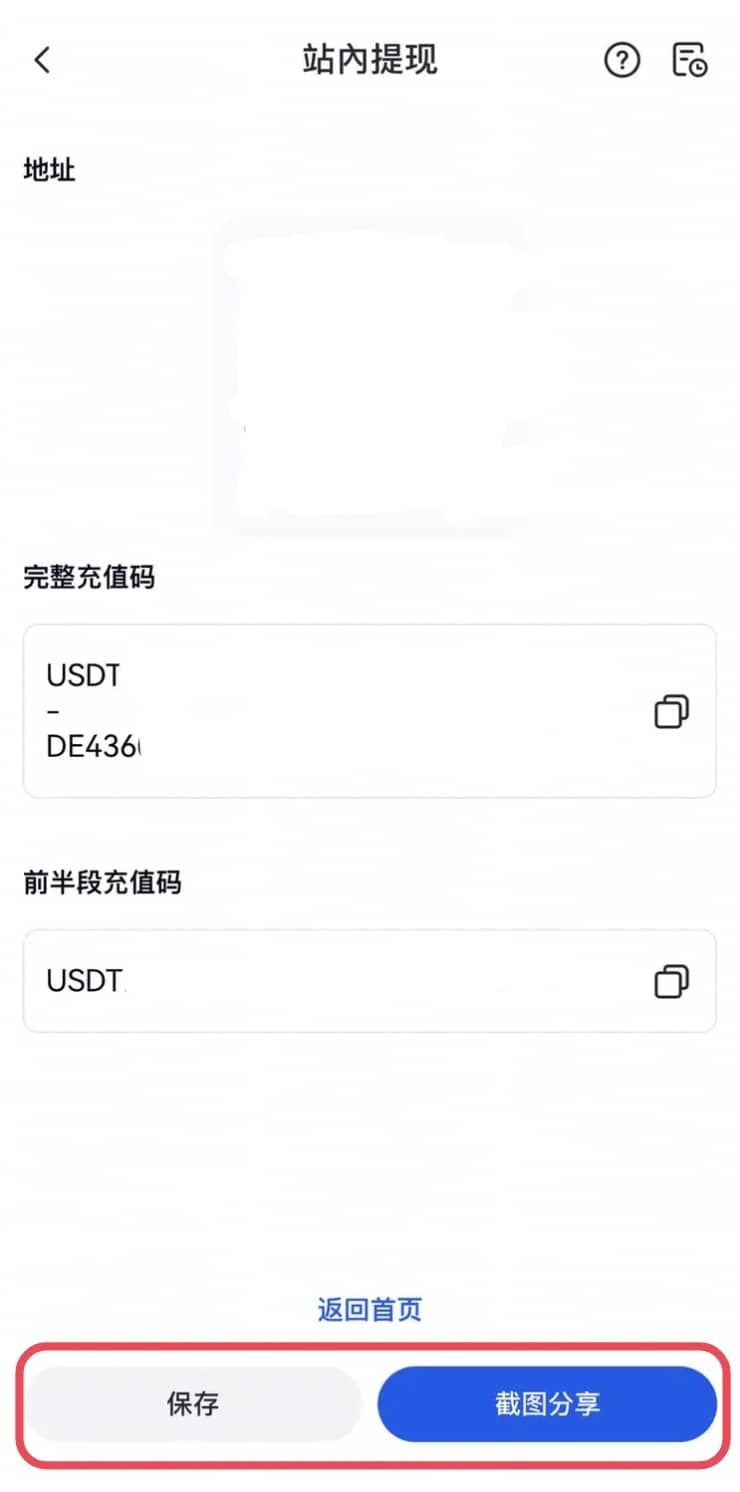 6.提现完成后,可以点击“保存”、“截图分享”,或者选择完整/前半段充值码进行复制。