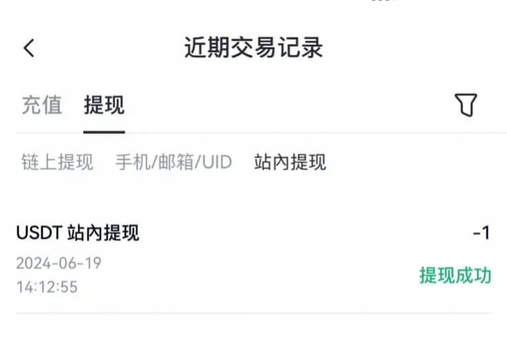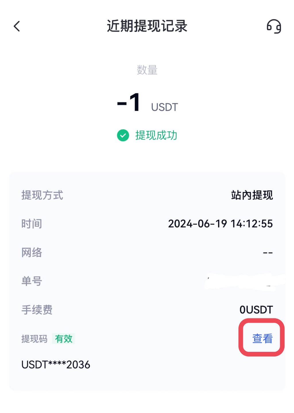 7.也可以在选择提现币种的页面点击右上角账单图示,进入近期交易记录页面,点击该笔提现查看详情,点击“查看”复制完整的充值码(提现码)。