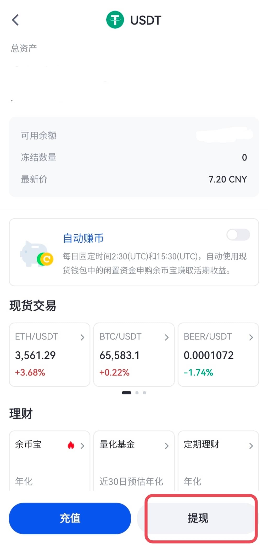 2.或者点击“现货账户”,在搜索栏中搜索需要提现的币种,点击进入该币种页面后,点击页面下方的“提现”。