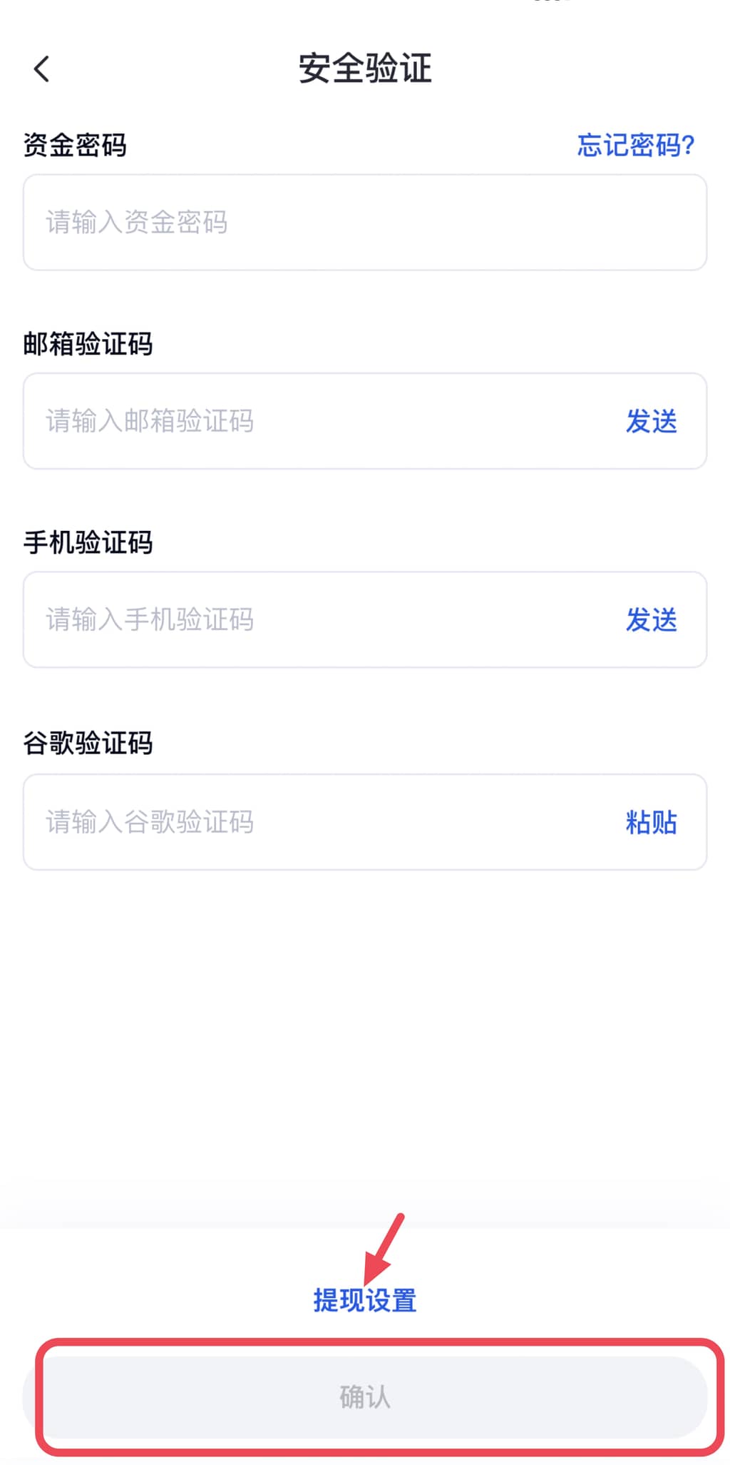 然后按照页面提示输入资金密码、邮箱验证码、手机验证码、谷歌验证码,然后点击“确认”。