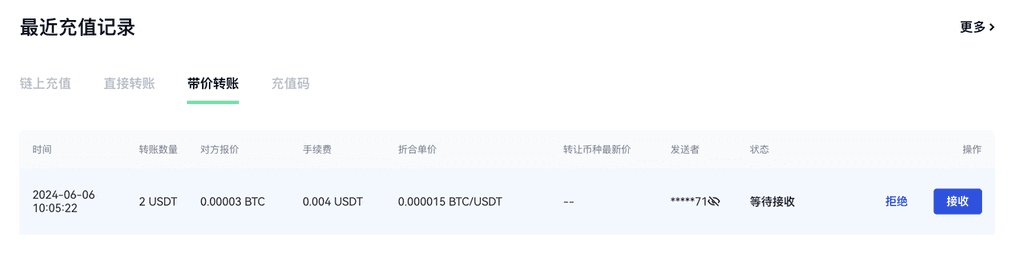 对方可在网页端中点击”资产”-“资金管理”-“充值”-“站内”,下拉页面进入最近充值记录-选择”带价转账”查看转让信息,可点击操作选项中的”接收”或”拒绝”,如对方拒绝接收,冻结的资金会退回至账户。