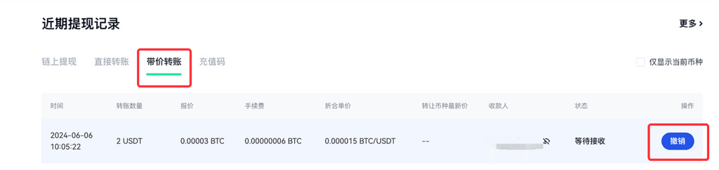转让成功后,可在页面下方的”近期提现记录”-点击”带价转账”查看此笔转账信息,此时如需取消,可以点击”撤销”来撤销订单,撤销操作后,冻结资金将退回至账户。