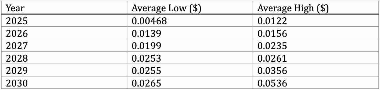 基于专家意见、市场分析和当前趋势,以下是 2025 年至 2030 年 Duckchain (DUCK) 的年度价格预测: