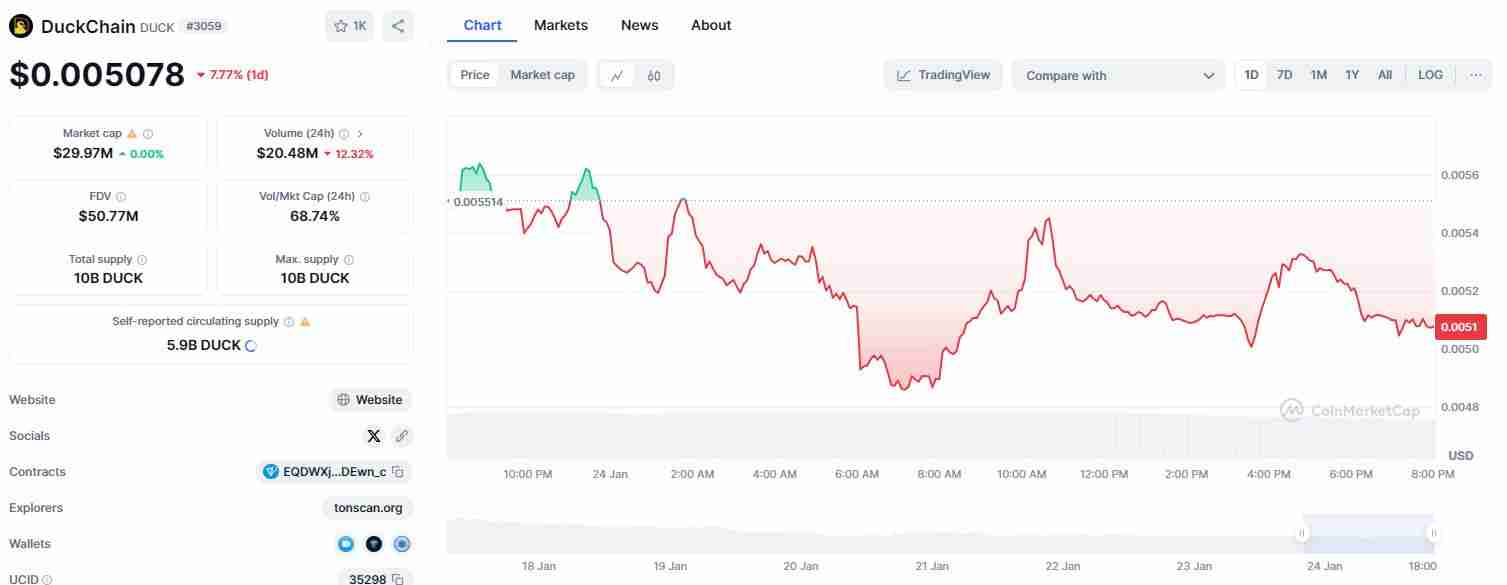 截至 2025 年 1 月 24 日,Duckchain (DUCK) 的价格为 0.0050750 美元,与前 24 小时相比下降了 7.72%。过去 30 天的数据显示,Duckchain 的价值上涨了 153.75%,具有指数增长潜力。