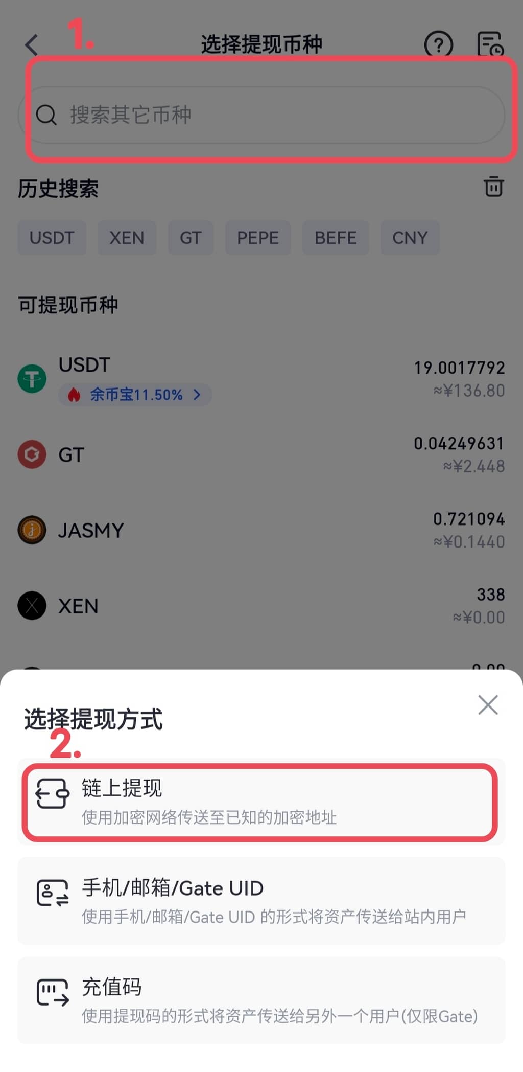 搜索选择提现币种,点击“链上提现”。