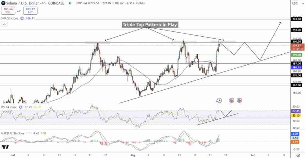 从技术走势来看,Solana正面临关键的方向选择。在4小时图上,价格在206至210美元区间已三次触及高点,形成三重顶结构,这反映出多空双方在此区域的激烈博弈。能否成功突破这一阻力位,将决定Solana的下一步走势。