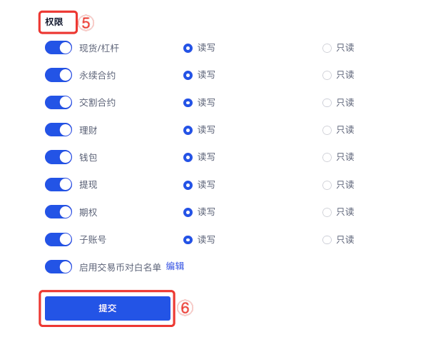 ⑤ 权限:可选择读写/只读。注意:币对信息不能为空,添加交易后方可保存。
