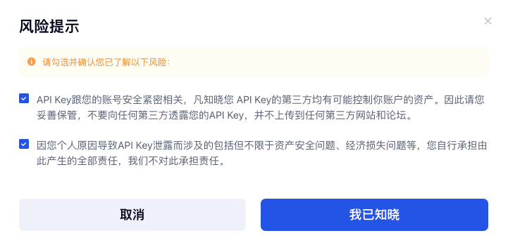 4. 提交后会弹出风险提示,请仔细阅读,勾选并点击“我已知晓”或点击“取消”。