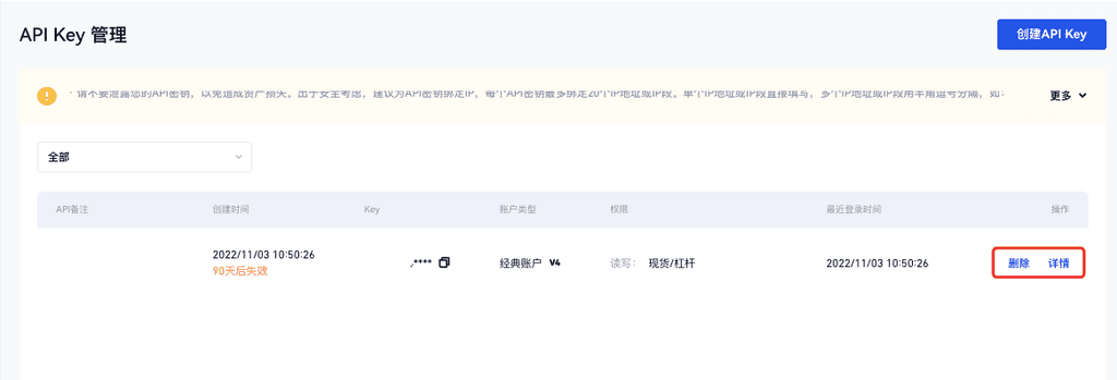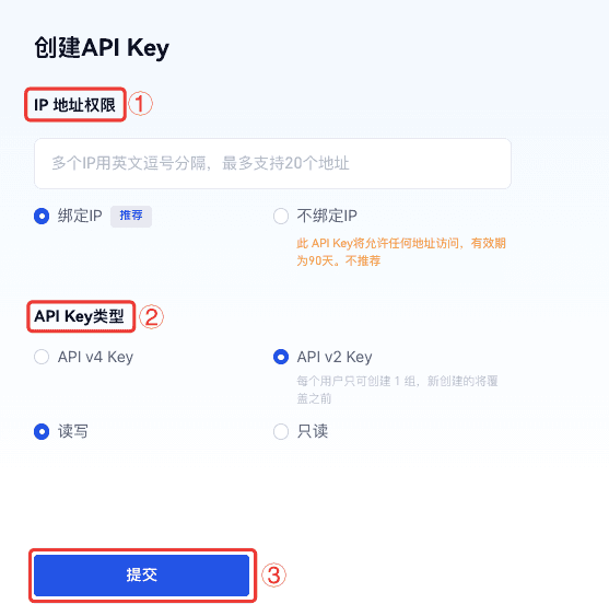 ② API Key 类型:选择API v2 Key。每个用户只可创建 1 组,新创建的将覆盖之前。权限可选择读写/只读。
