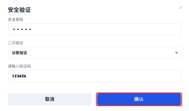 输入资金密码,选择二次验证方式后输入验证码,点击“确认”。