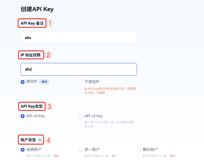 - APIv2 在个人账户的 “APIv2 Keys” 入口申请,APIv4 在个人账户的 “APIv4 Keys” 页面申请。