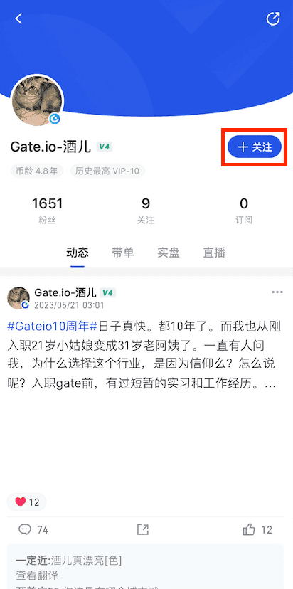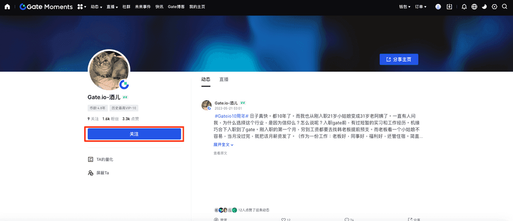 在当前数字化时代,关注他人的动态成为了一种社交常态,无论是在Web版还是App版,关注“TA”的动态都相对简单,首先,在Web版中,用户需登录Gate个人账户,点击导航栏中的“币圈”并选择“动态”,接着在搜索栏中输入想要关注的用户昵称,点击搜索后在用户列表中找到目标用户,点击其头像进入动态页面,最后点击“关注”即可成功关注;而在App版中,用户打开Gate App后,登录个人账户,点击底部“币圈”中的“动态”,同样点击右上角的“搜索”进行用户查找,进入目标用户的动态主页面后,点击右上角的“+关注”即可完成关注,关注后用户可以随时查看“TA”的历史动态、实盘和直播回放,关注人数与被关注人数也一目了然,轻松掌握“TA”的最新动态,享受更为便捷的社交体验。