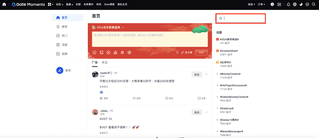 1、打开Gate App,登录个人账户后,点击页面底部“币圈”——“动态”——点击右上角“搜索”。