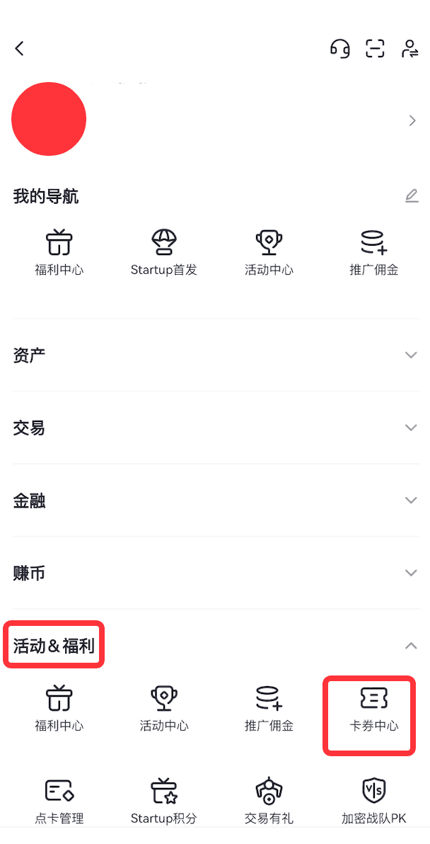 1、打开Gate手机App,登录个人账户,在App首页点击左上角头像——在页面找到“活动&福利”——点击“卡券中心”。