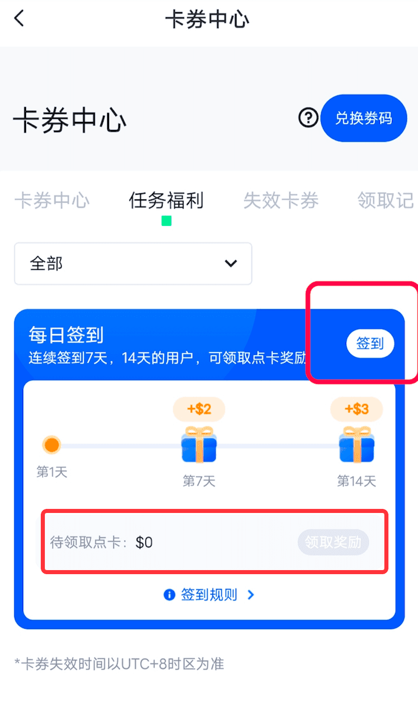 2.连续签到14天,可再领取$3点卡奖励;