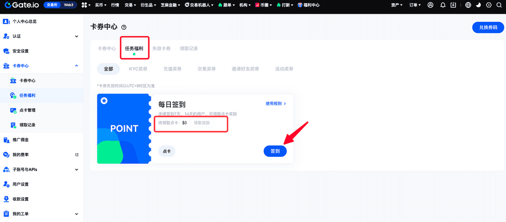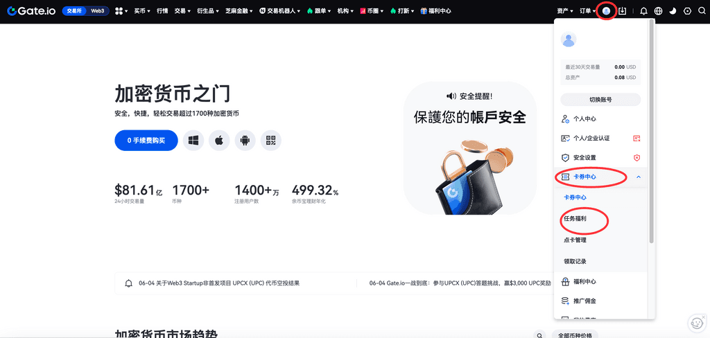 1、 登录Gate个人账户—点击右上角个人头像,下拉页面点击“卡券中心”—“任务福利”,进入“任务福利”页面。