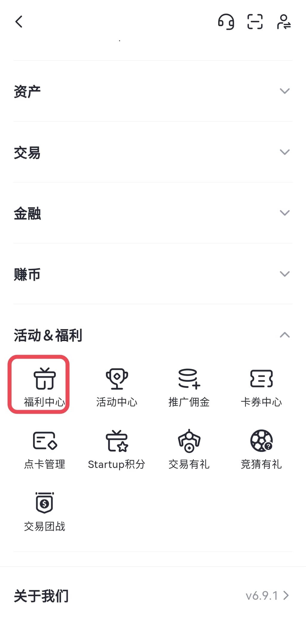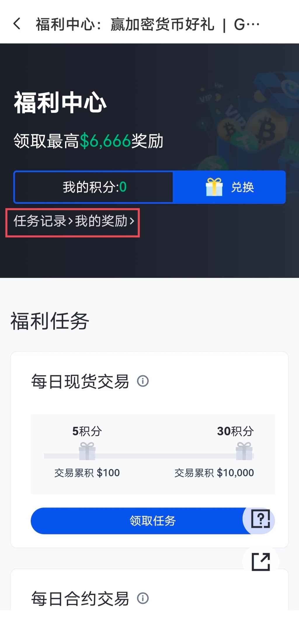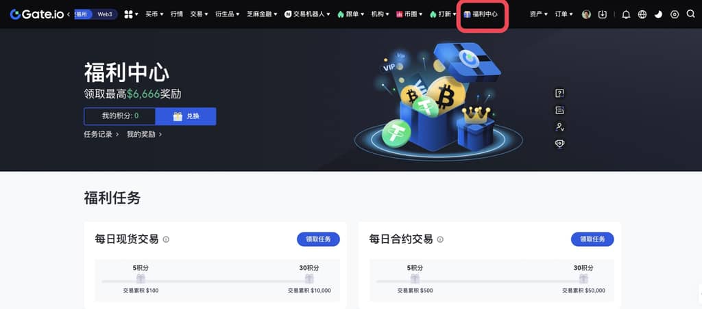 1.登录Gate个人账户,点击导航栏左上四叶窗后选择“福利中心”或直接点击导航栏“福利中心”,进入“福利中心”界面。