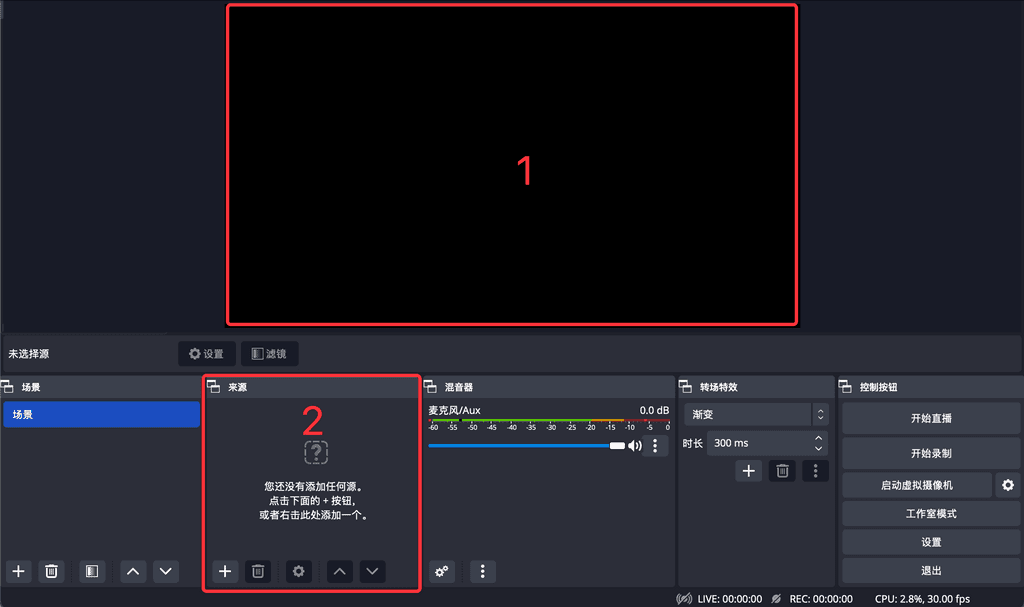 ① 你的直播画面。因为还未添加任何东西所以显示黑屏。
