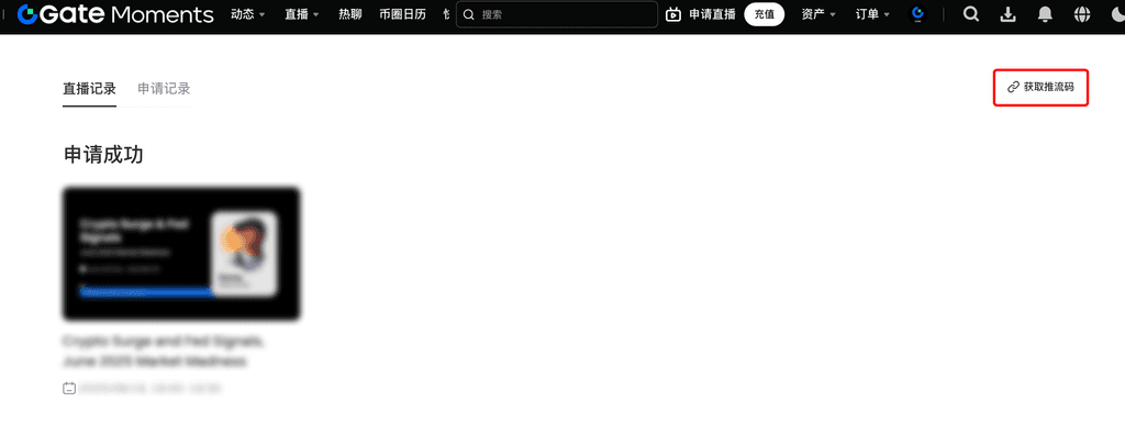 在 Gate app 提交直播申请且审核通过后,可在申请记录页面获取“直播推流码”。