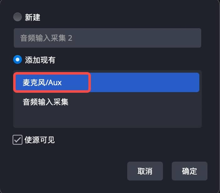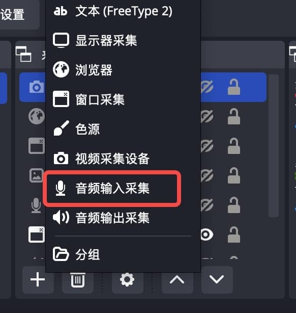 3、点击➕,点击音频输入采集,选择麦克风,点击确定。