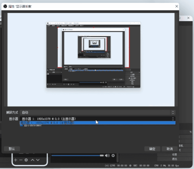如果有两个显示器就选择你需要直播展示的那个,再次点击确定。现在可以在主界面看见你的直播内容了。
