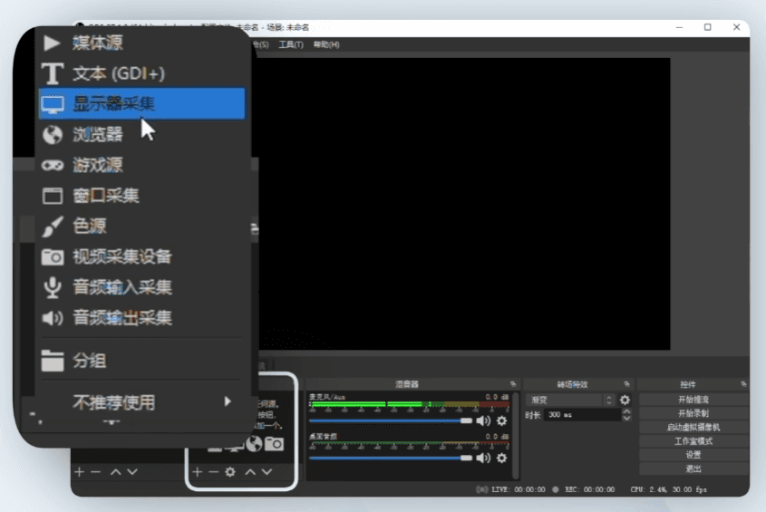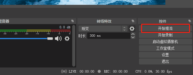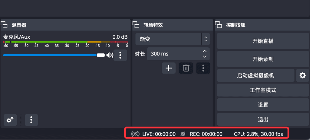1、安装好后打开OBS关闭欢迎向导,来到OBS的主界面。