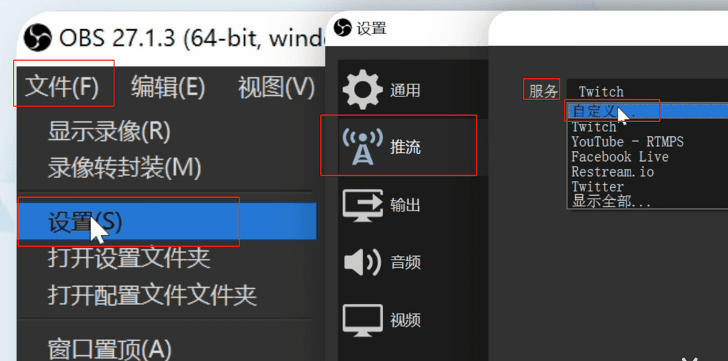 6、在OBS的顶栏选择“文件”中的“设置”,选择“推流”选项,将“服务”设置为“自定义”
