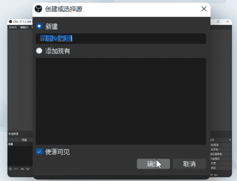 2、在“来源”窗口点击“➕”,点击“屏幕采集”,点击确定,选择你的屏幕,再点击确定。