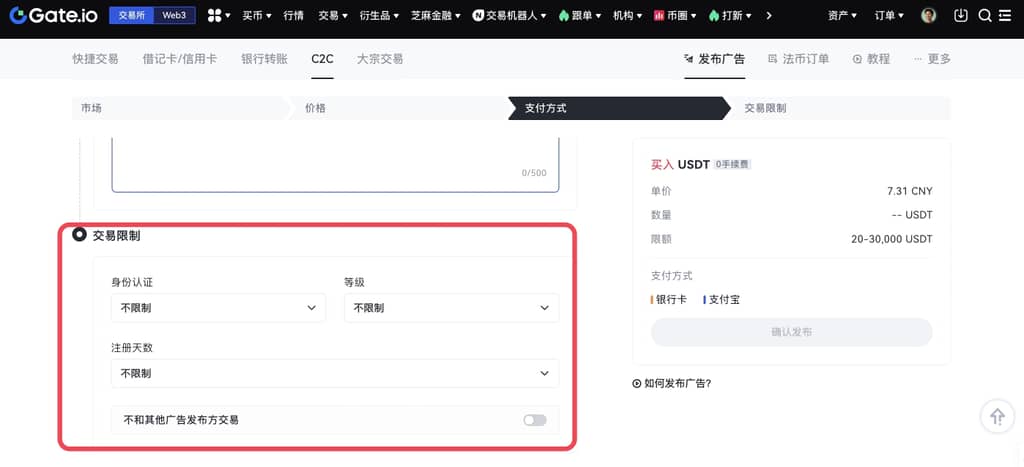 ②身份限制类型:不限制、身份认证; 等级限制类型:不限制、VIP1以上、VIP5以上、VIP10以上;注册天数限制类型:不限制、5天以上、10天以上、30天以上;还可以选择是否和其他广告发布方交易。