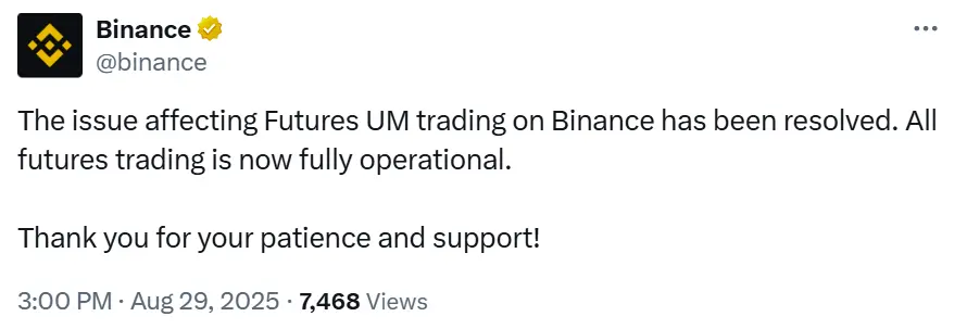 huangt 消息,币安发文宣布影响合约交易的问题已解决,目前所有合约交易已全面恢复。
