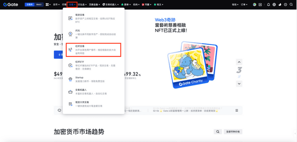 1、登录Gate个人账户,点击页面上方导航栏的“交易”——“杠杆交易”: