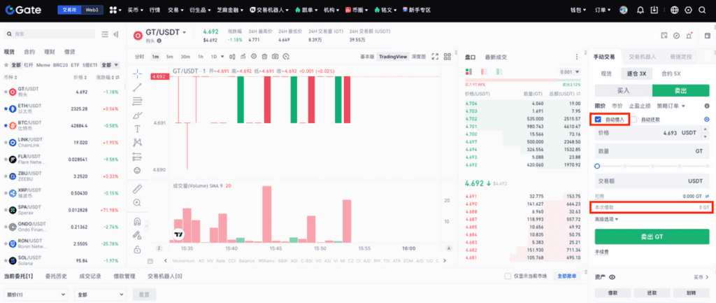 2、进入“杠杆交易”页面之后,在左侧选择对应的交易对进行交易(以GT/USDT为例)。