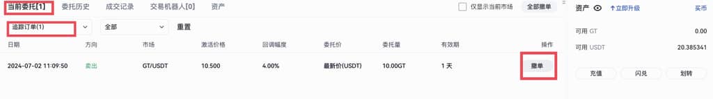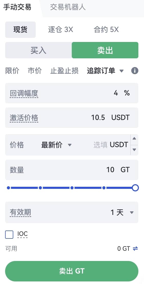 用户小张有10 GT,目前GT价格还在上涨,小张想在价格回调时高价卖出,可以设置追踪订单追踪价格走势。如图设置:回调幅度4%,激活价格10.5 USDT,委托价为最新价,卖出10GT,有效期1天,不开启下单即撤。点击卖出: