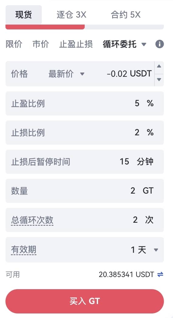 买入委托价格为最新价-0.02,止盈比例5%,止损比例2%,止损后暂停时间15分钟,买入量2 GT,循环2次,有效期1天。