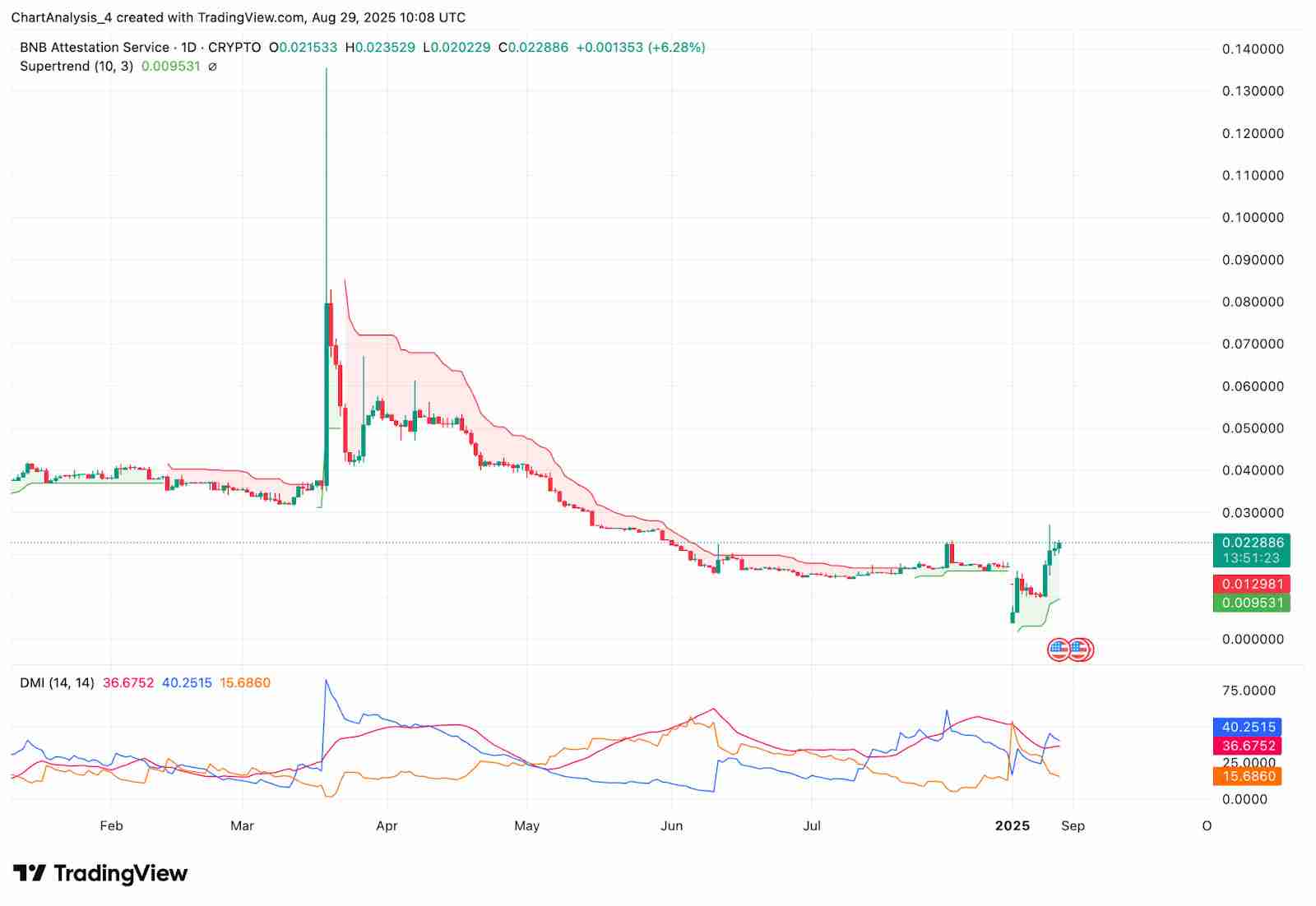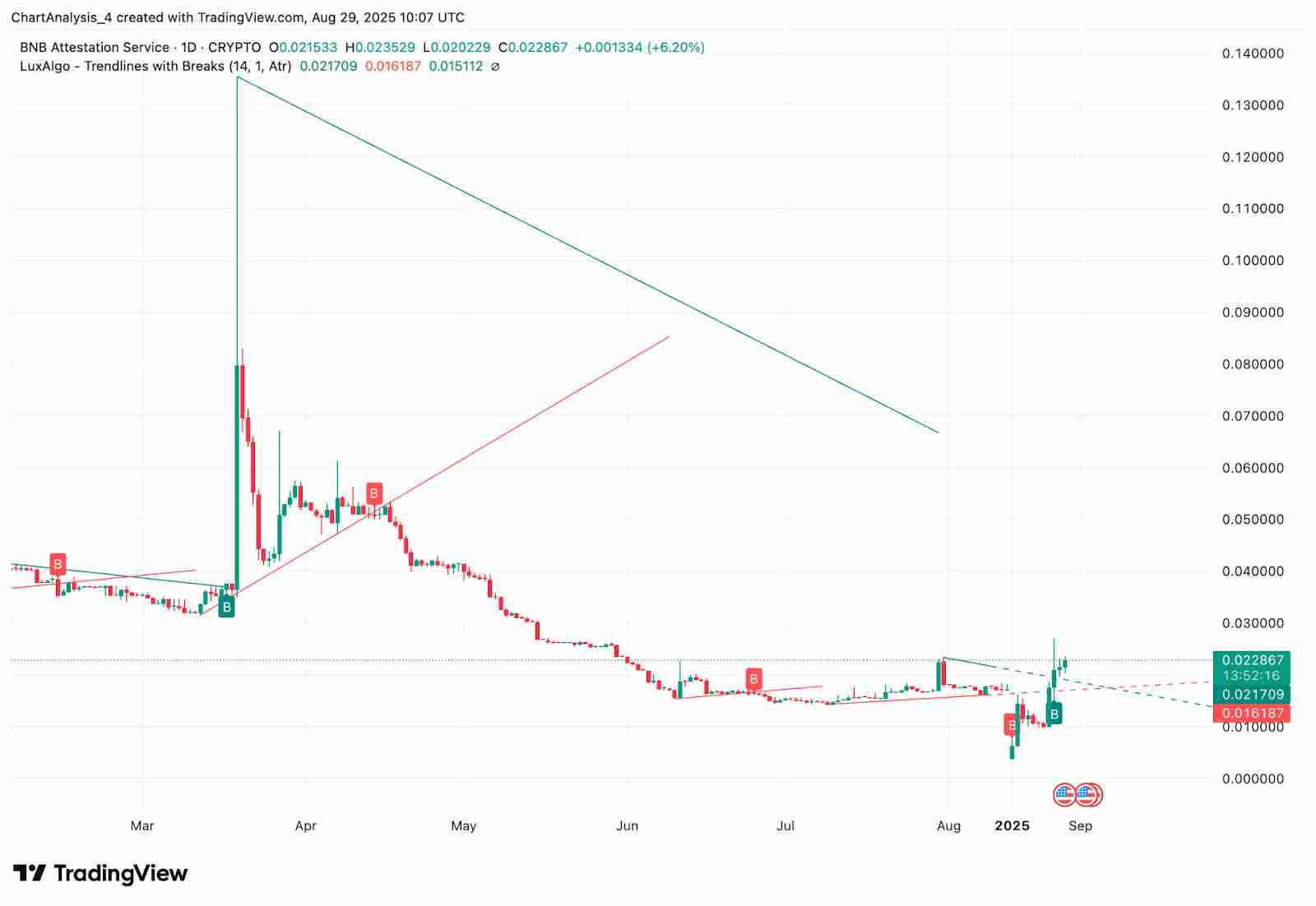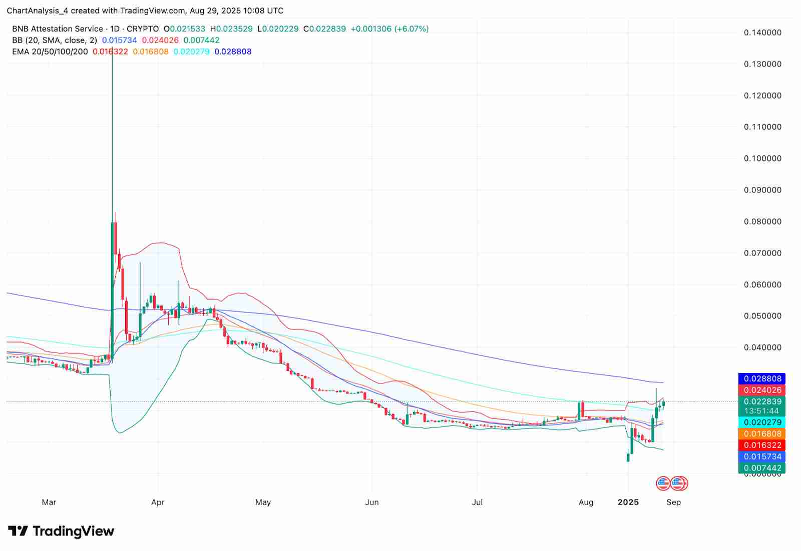 BNB 认证服务 (BAS) 在长期下跌后重拾升势。该代币交易价格接近 0.022 美元,已从数月低点反弹,并预示着趋势逆转的早期迹象。