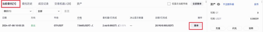 确认无误后,点击【卖出GT 】,下达限价委托。当市场价格达到或者优于您设定的限价时,限价委托会完成交易。