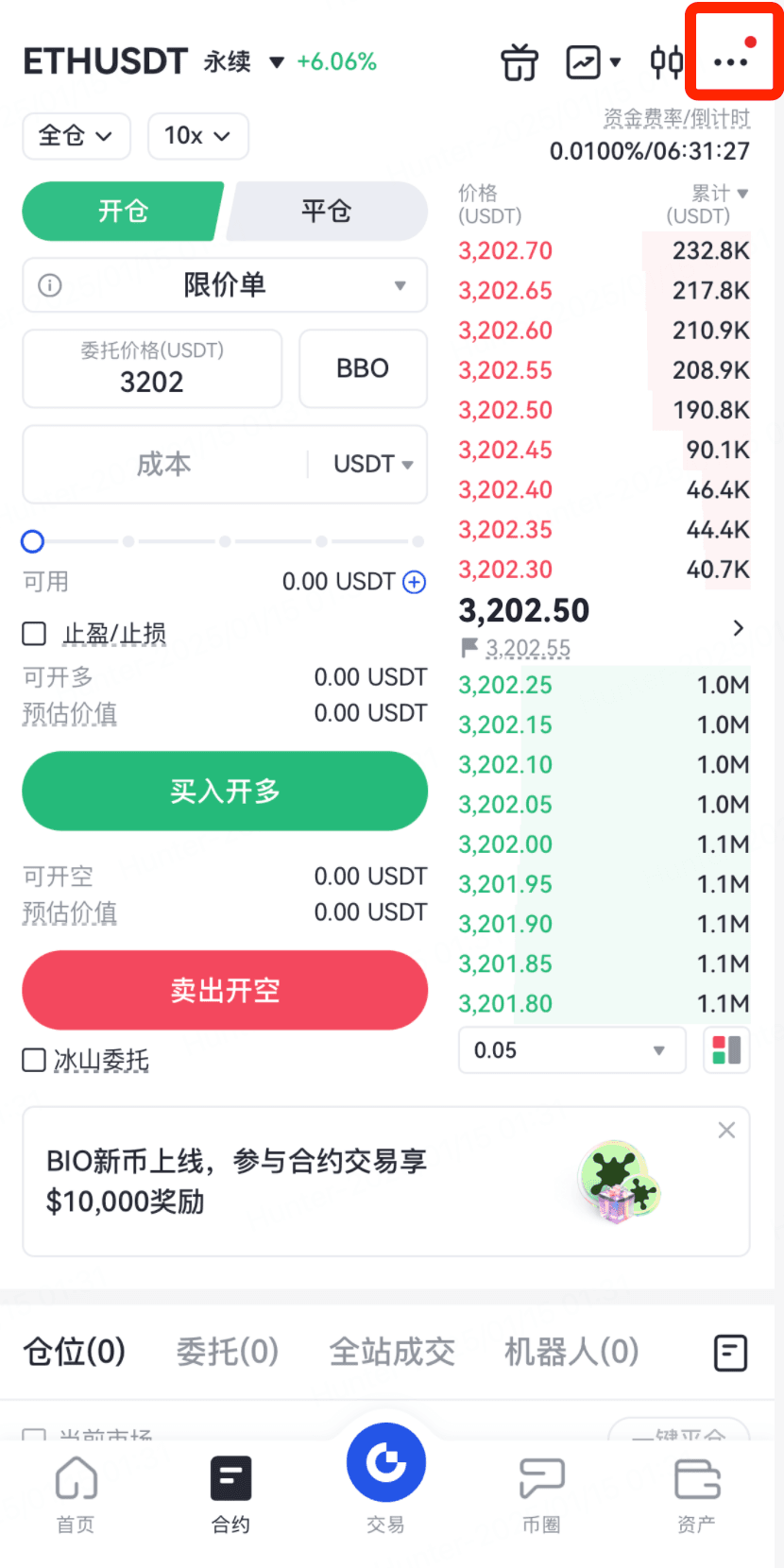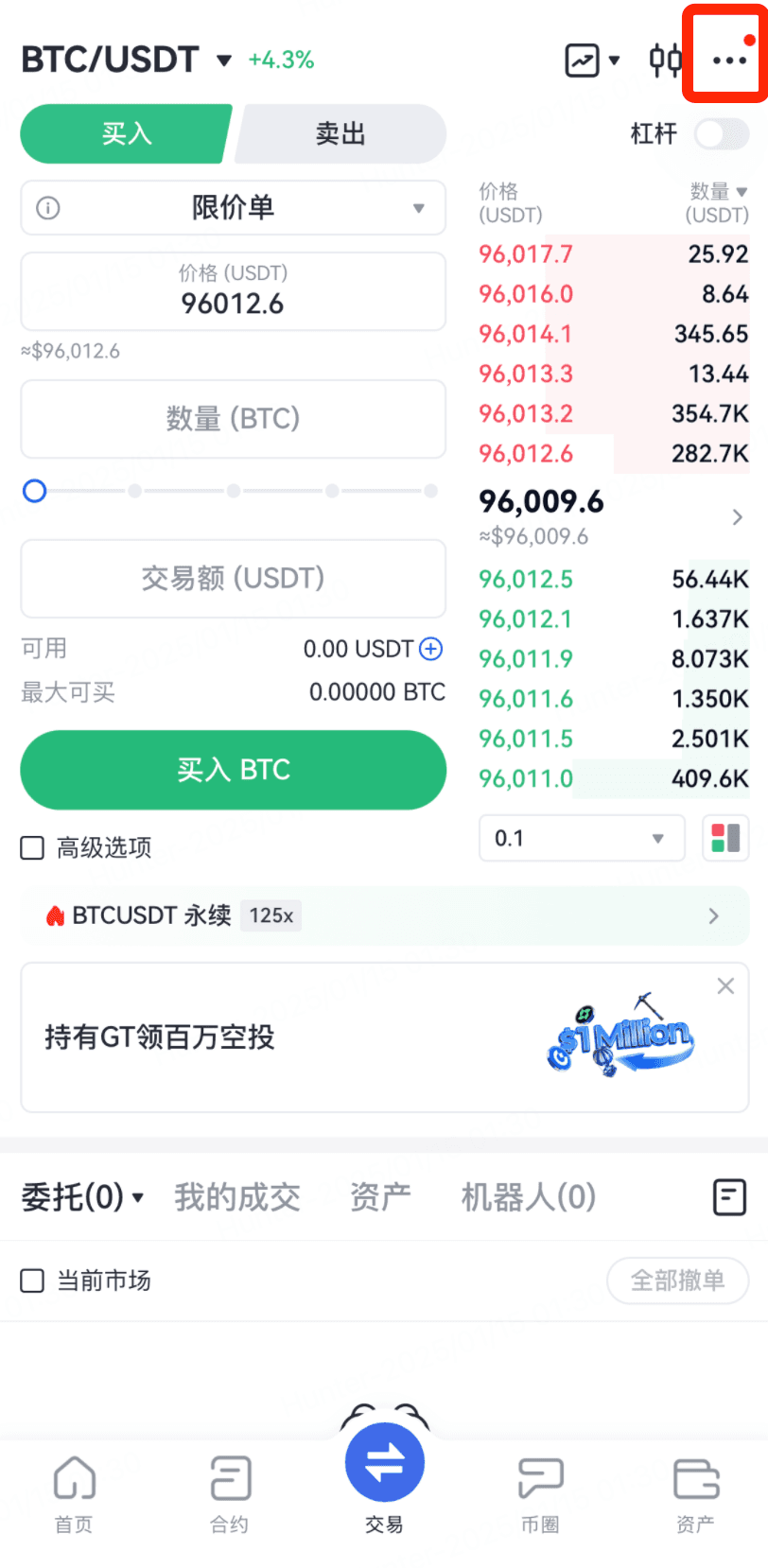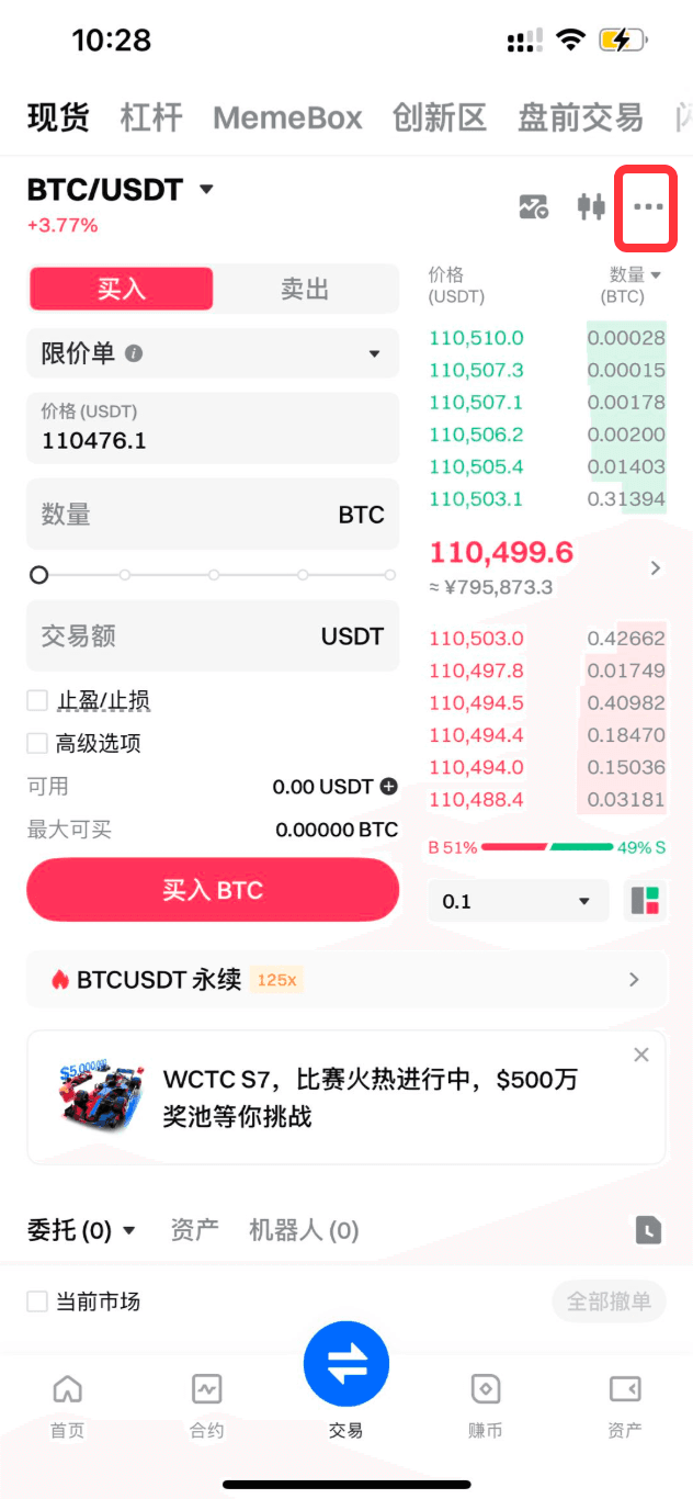 Step 1: 进入现货或者USDT永续合约下单页,点击更多入口
