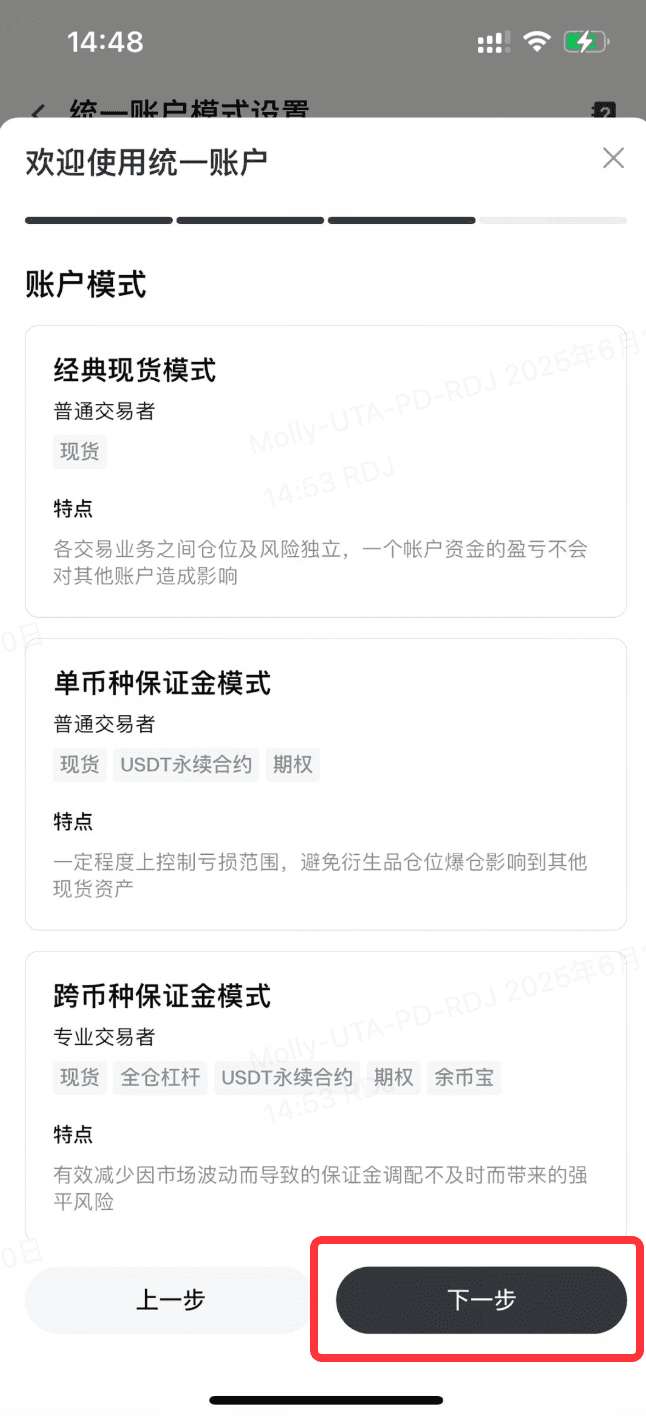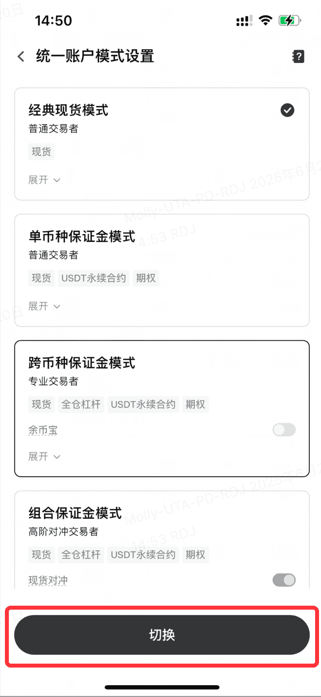 统一账户共支持4种模式,分别是:经典现货、单币种保证金、跨币种保证金、组合保证金。如果您想切换账户模式,步骤如下: