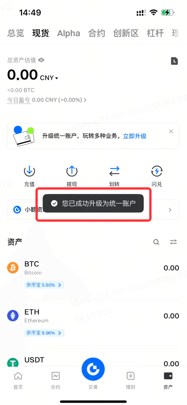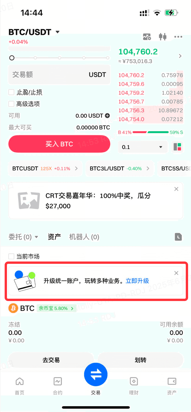 1、现货/合约下单页——点击右上角“…” 然后选择「账户升级」