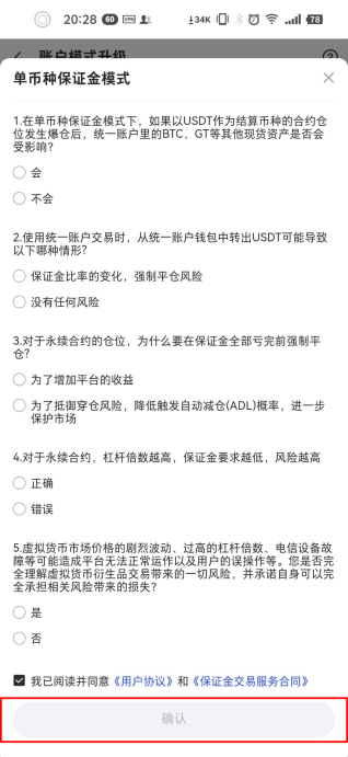 Step 2: 完成测试问卷,仔细阅读用户协议并勾选,点击「确认」按钮