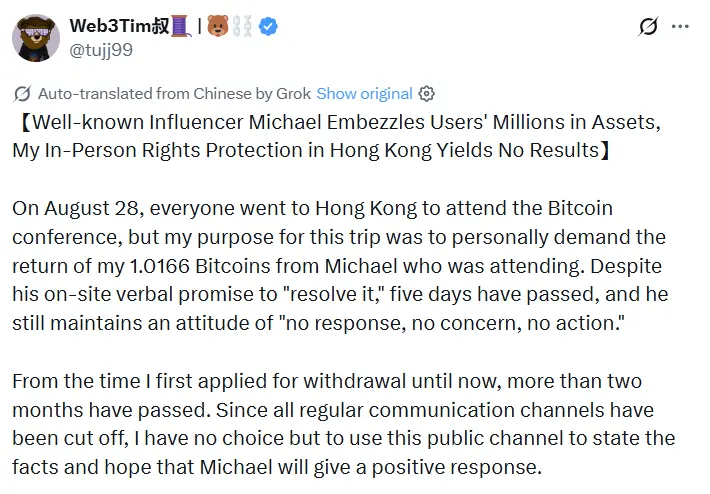 Michael 先以“私钥遗失”为由承诺“逐步返还”,后又提出“折扣提币”解决方案,但均未兑现。用户随后账户被冻结、被移出群组并遭屏蔽。8 月 27 日在香港 Bitcoin 大会现场, Michael 再次口头承诺处理,但至今无结果。用户表示已报警并寄送律师函,仍未获回应,将继续通过法律途径维权。
