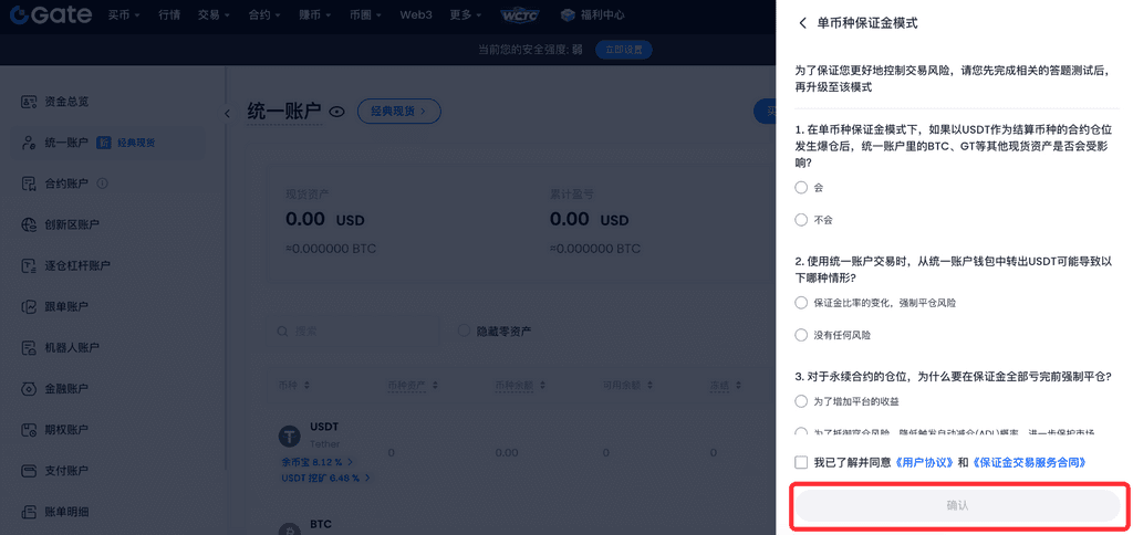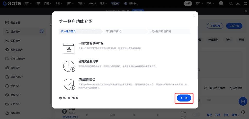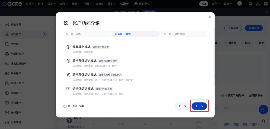 统一账户是一种集成多种交易模式的账户系统,包含经典现货、单币种保证金、跨币种保证金和组合保证金四种模式,其中经典现货和单币种保证金模式不设门槛,而跨币种保证金模式则要求现货账户总资产不低于500 USD,组合保证金模式需联系客服或大客户经理进行开通,用户可以通过现货下单页、交易设置等多个入口快速完成账户升级,升级流程包括选择账户模式、完成测试问卷、阅读用户协议等步骤,成功升级后用户可在一个账户中实现现货、杠杆及合约的交易,避免资金划转的繁琐,同时享受保证金共享带来的资金利用率提升,系统还支持自动借还功能,确保交易的便捷性与高效性,最终解释权归Gate所有。