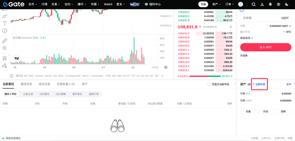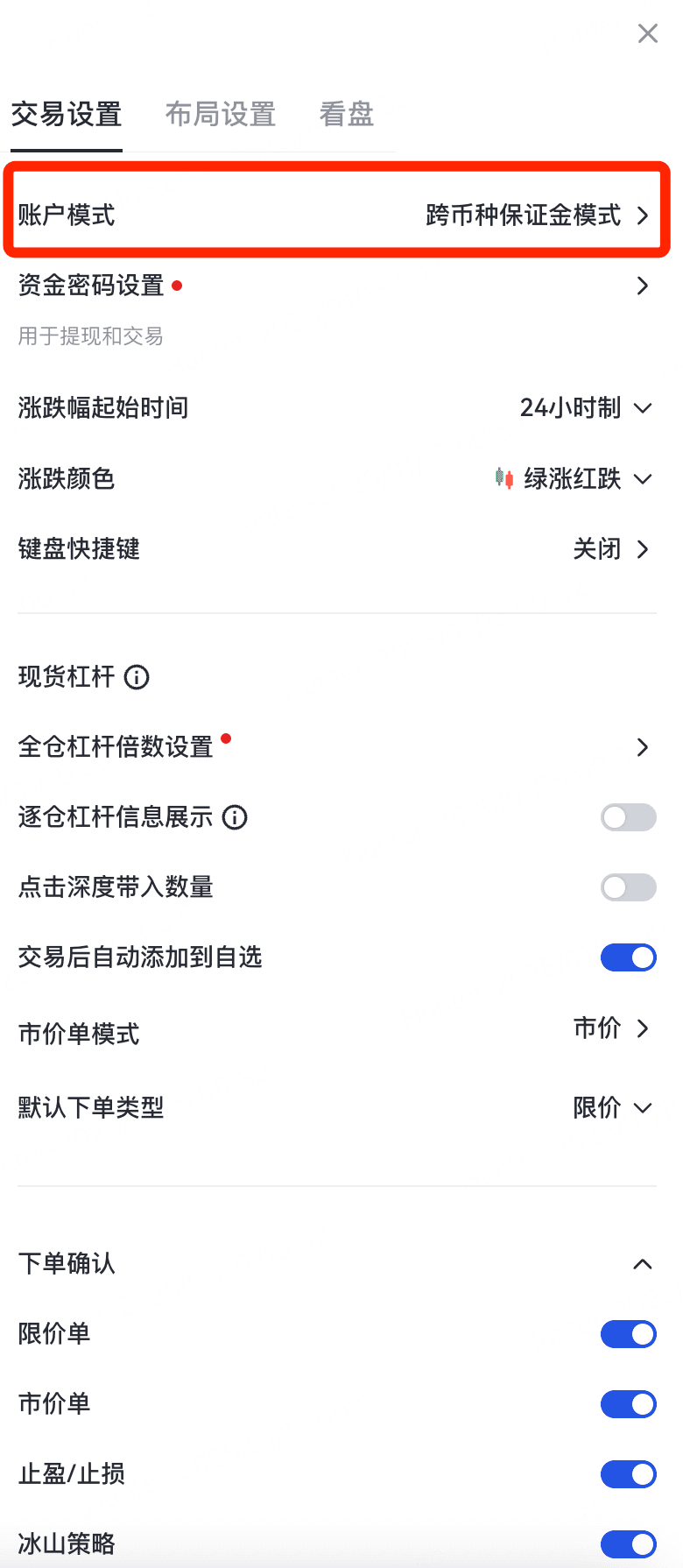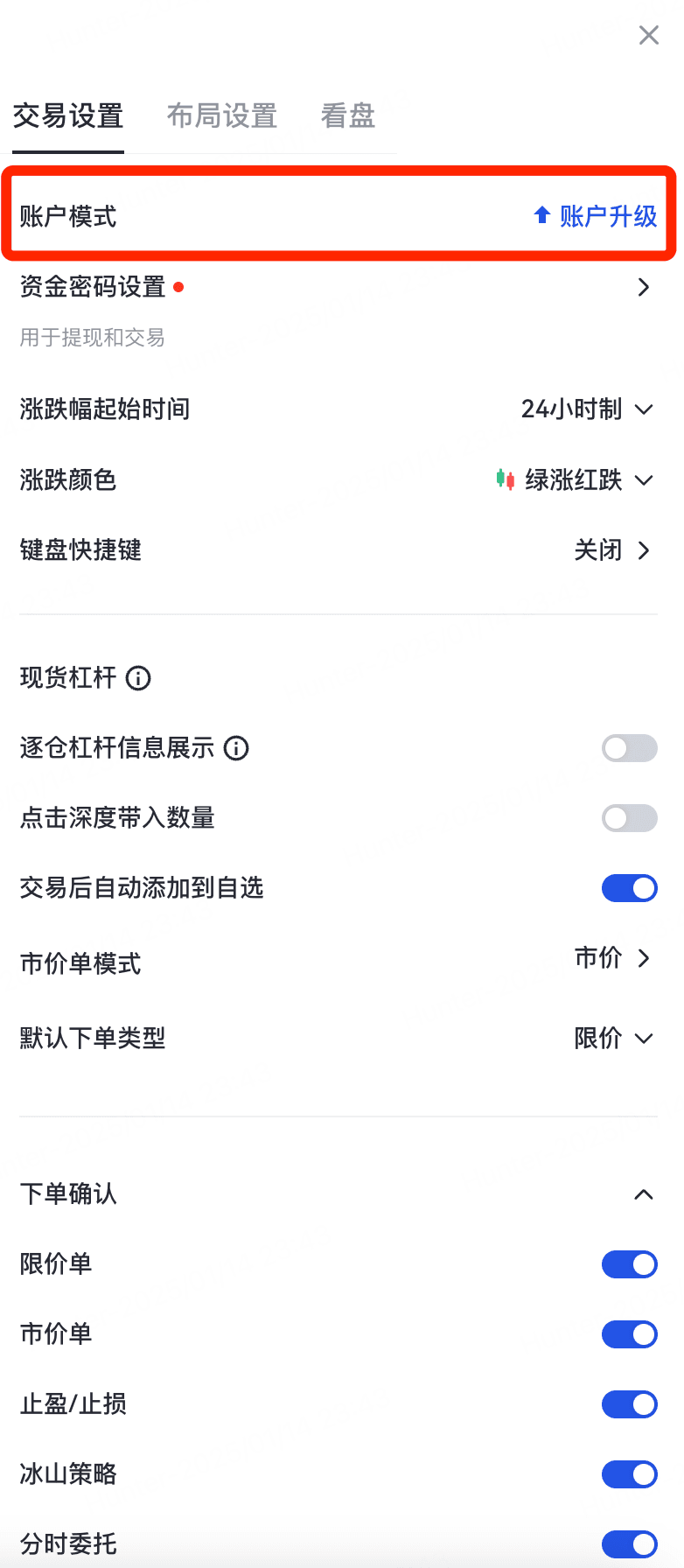 点击现货下单页顶部右侧的交易设置图标,出现如下弹窗,点击账户模式旁的「账户升级」