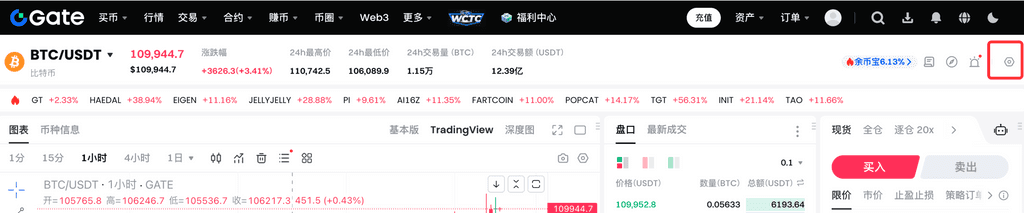或者您也可以切换到现货下单页/USDT永续合约市场,点击顶部右侧的交易设置图标
